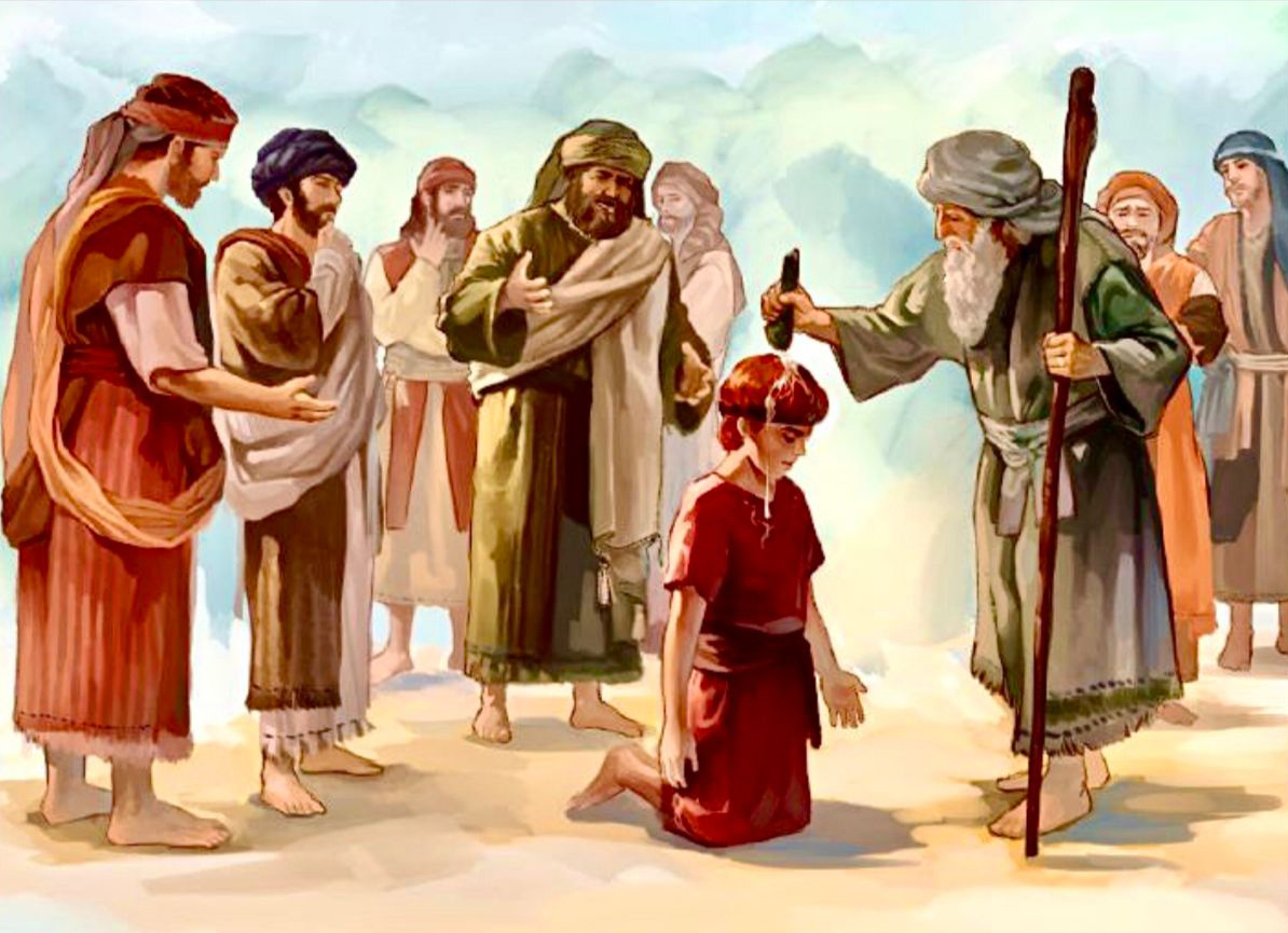 11撒母耳对耶西说:「你的儿子都在这里了吗?」 他说:「还有一个最小的,看哪,他正在放羊。」撒母耳对耶西说:「你派人去叫他来;他若不来这里,我们必不坐席。」 12耶西就派人去叫他来。他面色红润,双目清秀,容貌俊美。 耶和华说:「起来,膏他,因为这就是他了。」 13撒母耳就用角里的膏油,在他的兄长中膏了他。从这日起, 耶和华的灵就大大感动大卫。 撒母耳起身回拉玛去了。